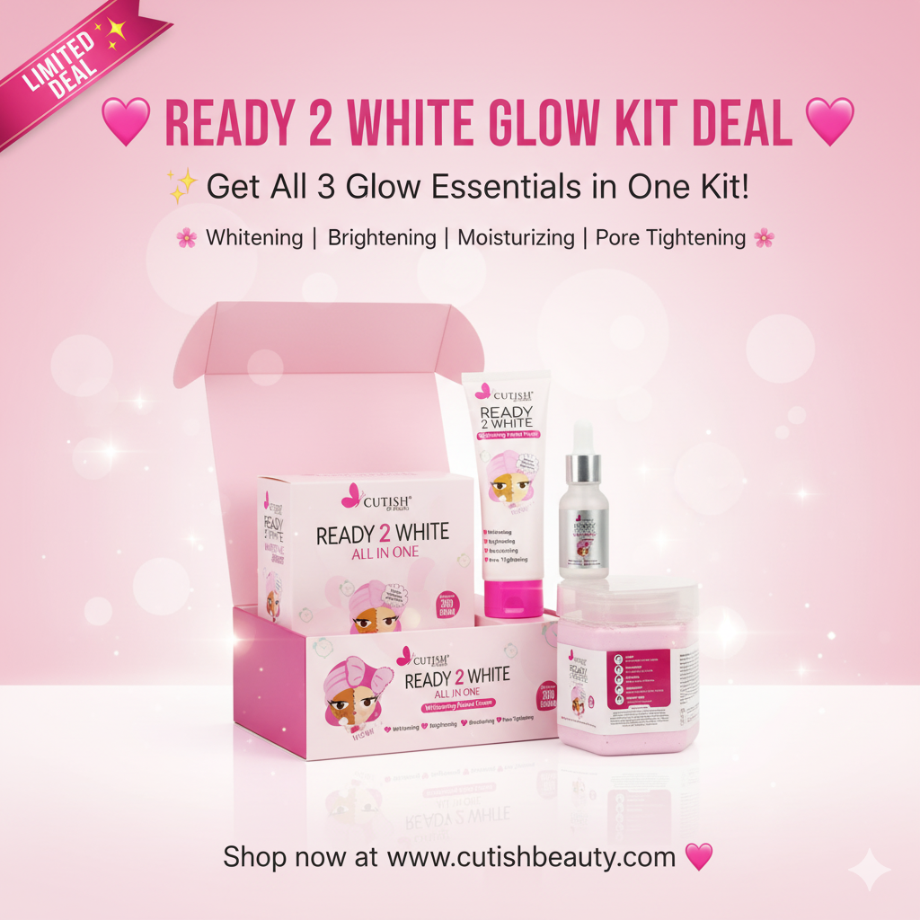 Unlock your skin’s natural radiance with the Ready To White Glow Kit — a powerful 5-step skincare system designed to brighten, nourish, and hydrate your skin for a stunning, glowing complexion. Perfect for all skin types, this kit targets dullness, uneven tone, and dryness to reveal fresh, luminous skin.